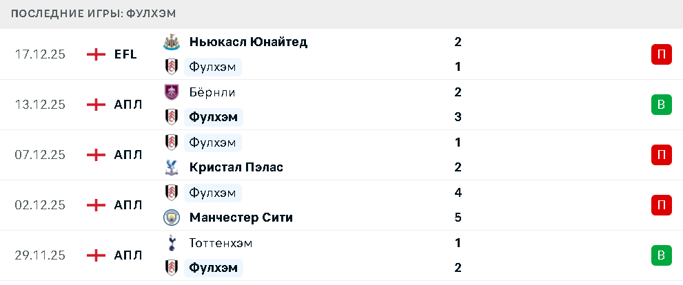 В пяти последних матчах во всех турнирах «Фулхэм» одержал две победы — над «Тоттенхэмом» и «Ньюкаслом», а также уступил «Манчестер Сити», «Кристал Пэлас» и «Бернли».