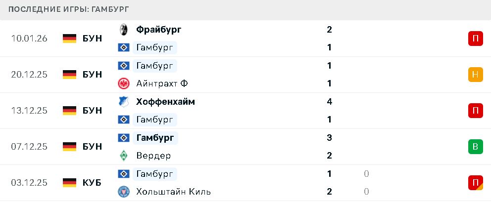 В пяти последних матчах во всех турнирах «Гамбург» одержал лишь одну победу — над «Вердером». Также были зафиксированы ничьи с «Хольштайном» и «Айнтрахтом», а поражения команда потерпела от «Хоффенхайма» и «Фрайбурга».