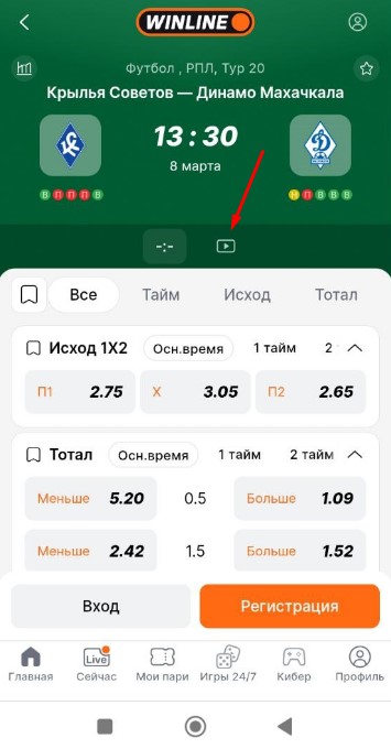 Еще один вариант — просмотр через «Винлайн». Для запуска эфира потребуется авторизация или регистрация, после чего достаточно открыть карточку спортивного события и нажать кнопку Play.