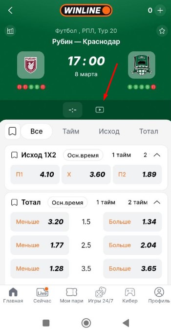 Видеопоказ появляется и у букмекеров, если событие добавлено в их раздел с прямыми эфирами. В «Винлайн» чаще всего нужно зайти в аккаунт или создать профиль, открыть карточку матча и нажать кнопку «Трансляция».
