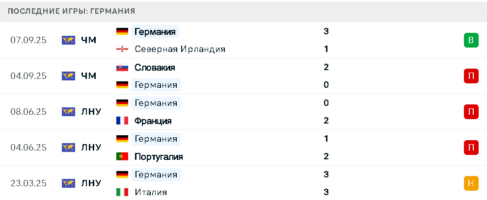 В пяти последних матчах в разных турнирах сборная Германии сыграла вничью с Италией, потерпела поражения от Португалии, Франции и Словакии, после чего была победа над Северной Ирландией.