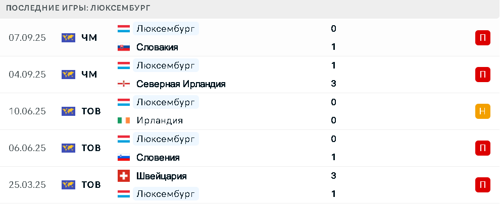 В пяти последних матчах в разных турнирах сборная Люксембурга потерпела поражения от Швейцарии, Словении, Северной Ирландии и Словакии. Также была ничья со сборной Ирландии.