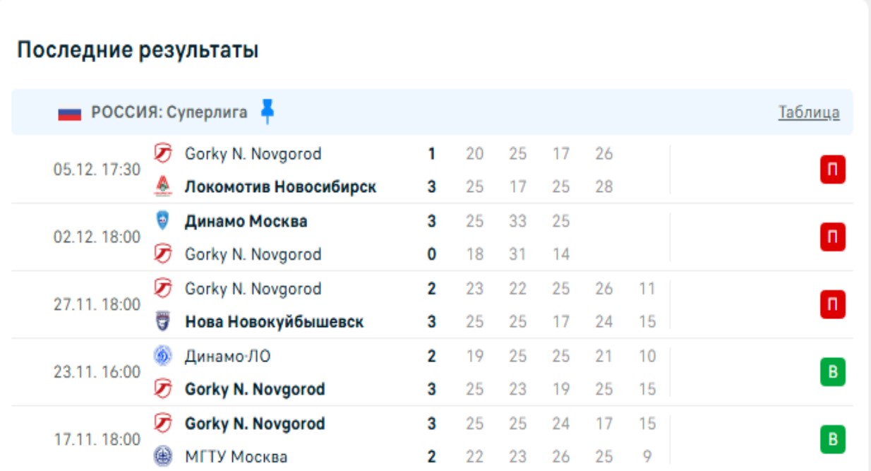 Серия поражений Горького началась на родном паркете в матче против Новы, развязка наступила в решающем пятом сете, который нижегородцы проиграли 11:15. Затем команда Дранишникова в 3 партиях проиграла в Москве Динамо, а в прошлом туре уступила еще одному из лидеров — новосибирскому Локомотиву (1:3).