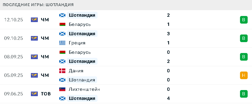 Шотландцы накануне квалификации ЧМ-2026 неплохо размялись, разгромив Лихтенштейн. После этого была нулевая ничья с главным конкурентом Данией, и победы над Беларусью (дважды) и Грецией.