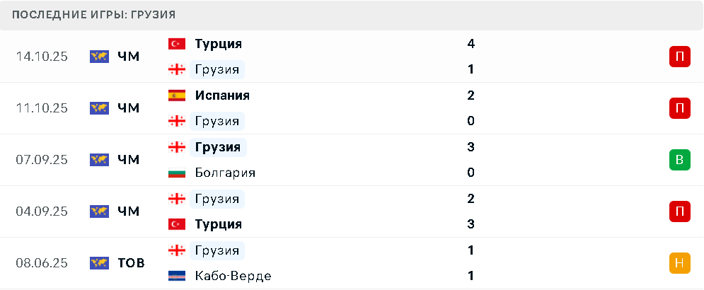 Перед началом квалификационного турнира сборная Грузии в товарищеском матче не смогла взять верх над командой Кабо-Верде, что стало уже тревожным звоночком. В четырех квалификационных играх грузины ничем не могут похвастаться кроме победы над болгарами. В остальных случаях команда уступила Турции (дважды) и Испании.