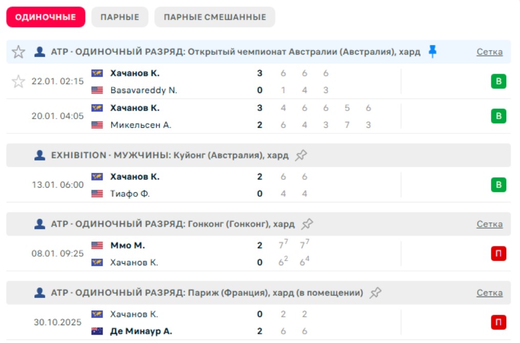 - Хачанов в прошлом сезоне не блистал на харде — с начала 2025 года у россиянина 17 побед в 33 матчах на этом покрытии.