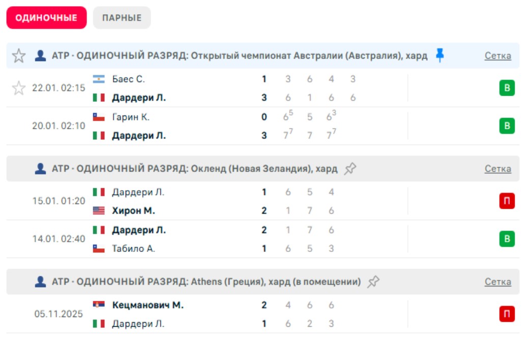 - Дардери специализируется на грунте. В 2025 году итальянец выиграл на грунтовом покрытии 30 поединков из 41, а на харде только 6 из 21.