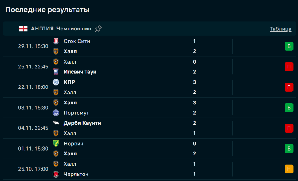 В последних пяти матчах «Халл» выиграл дважды и трижды проиграл. Победа над «Стоком» (2:1) на выезде показала способность бороться, но домашнее поражение от «Ипсвича» (0:2) выявило системные провалы в обороне. Команда часто теряет контроль над игрой во втором тайме, особенно против организованных соперников.