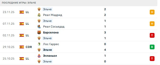 В ноябре команда показывает нестабильные результаты: поражения от «Атлетико» (0:1) и «Мальорки» (0:1) сменились победой над «Жироной» (2:1). В последних пяти матчах команда одержала три победы, демонстрируя способность набирать очки в ключевых поединках.