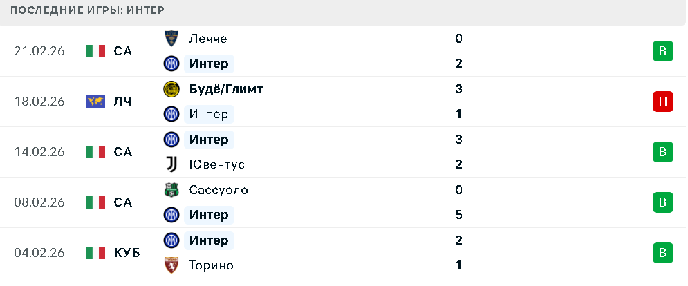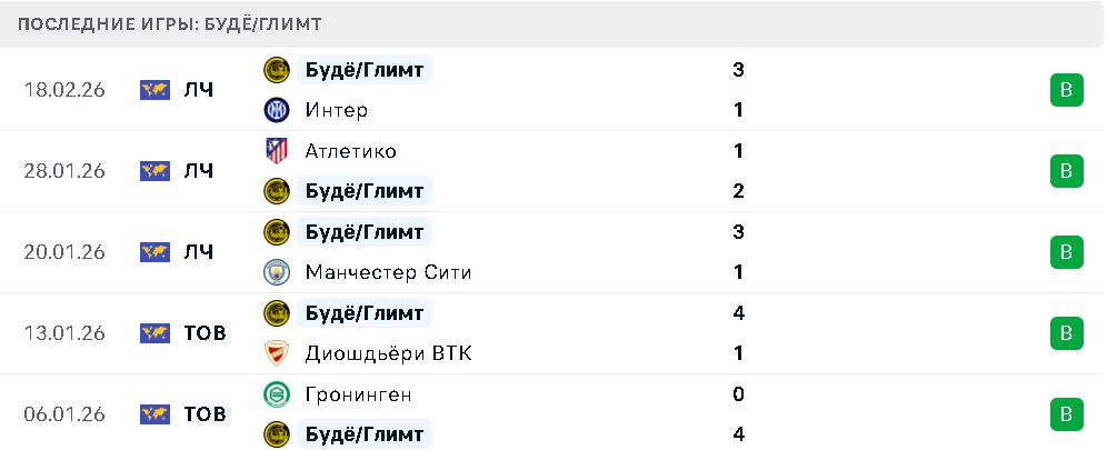 Поражение от «Буде-Глимт» стало единственным для «Интера» в пяти последних матчах. До этого «нерадзурри» прошли «Торино» в Кубке Италии, а в чемпионате одержали победы над «Сассуоло», «Ювентусом» и «Лечче». Команда демонстрирует хорошую результативность, но временами допускает провалы в обороне.