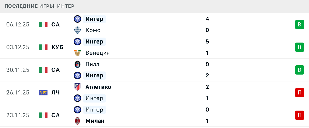 В пяти последних матчах «Интер» сначала минимально уступил «Милану» и «Атлетико», после чего одержал уверенные победы над «Пизой», «Венецией» и «Комо».