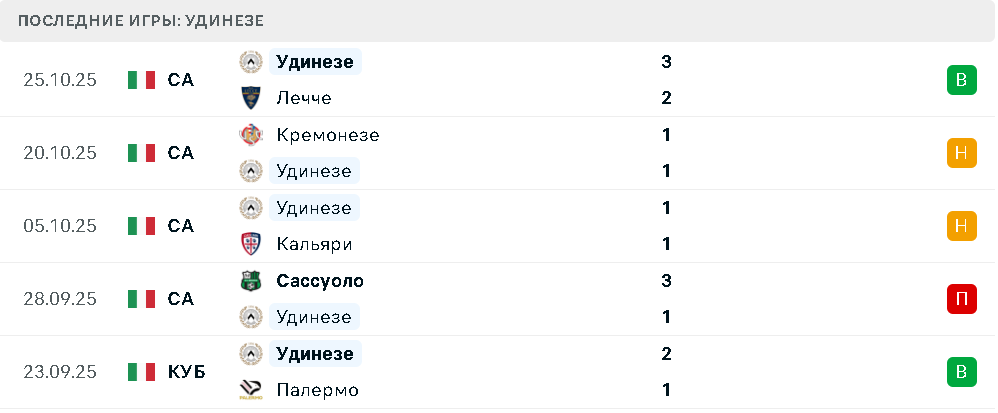 В пяти последних матчах в разных турнирах Удинезе потерпел только одно поражение от Сассуоло. В остальных случаях были победы над Палермо и Сассуоло при ничьих с Кальяри и Кремонезе.