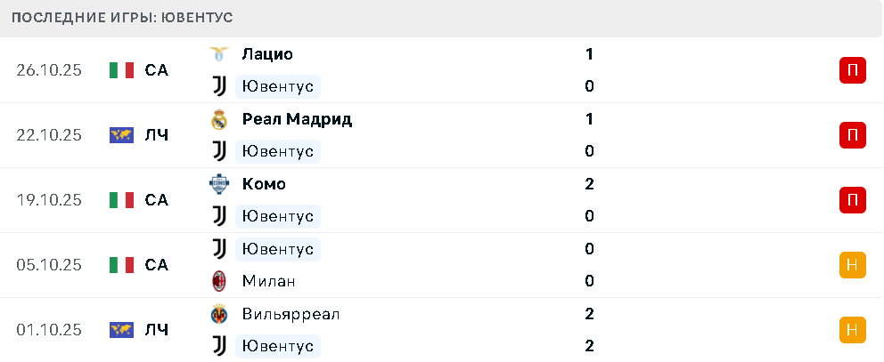 В пяти последних матчах в разных турнирах Ювентус сыграл вничью с Вильярреалом и Миланом. После этого были поражения от Комо, Реала и Лацио.