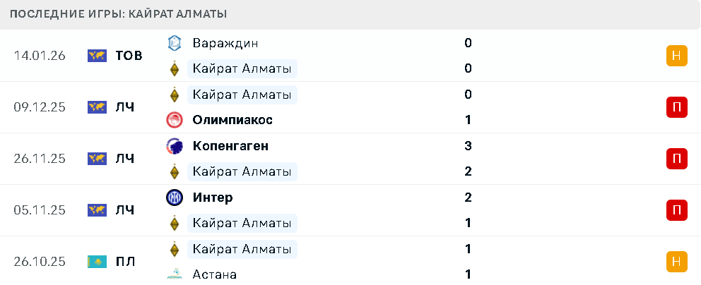 В пяти последних матчах «Кайрат» не одержал ни одной победы: две ничьи — с «Астаной» и «Вараждином», а также три поражения — от «Интера», «Копенгагена» и «Олимпиакоса».