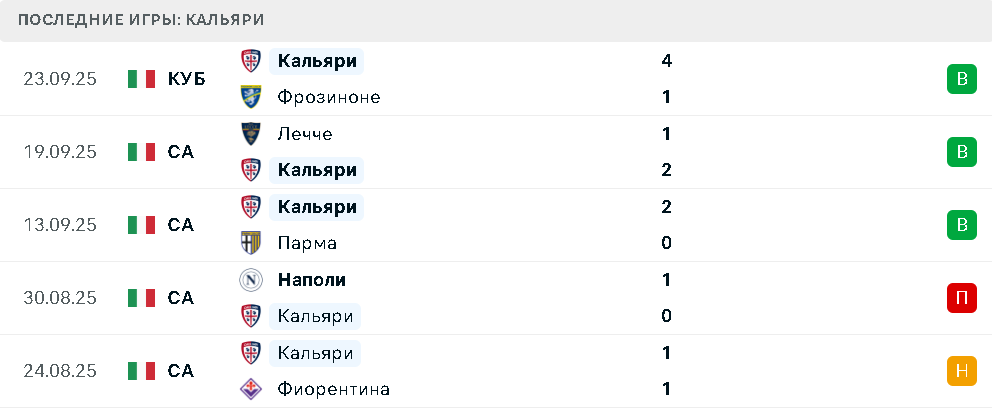 Последние игры Кальяри