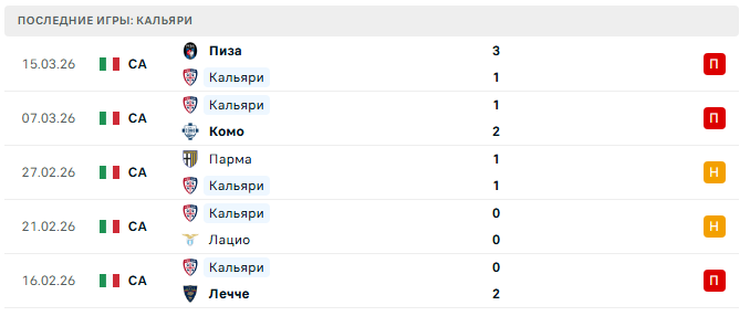 15 марта команда уступила Пизе 1:3 в гостях — и это отражает всё о нынешней форме сардинцев: не держат счёт, пропускают больше, чем забивают.