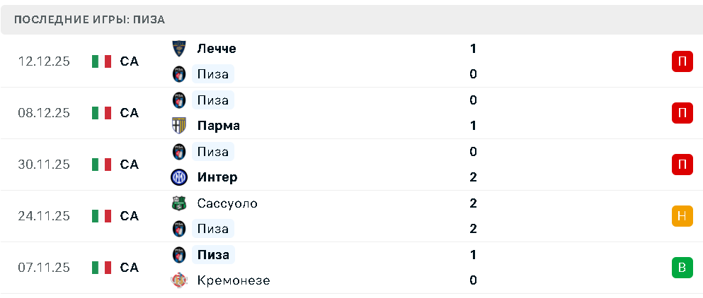 После победы над «Кремонезе» «Пиза» сыграла вничью с «Сассуоло», а затем потерпела три «сухих» поражения — от «Интера», «Пармы» и «Лечче».