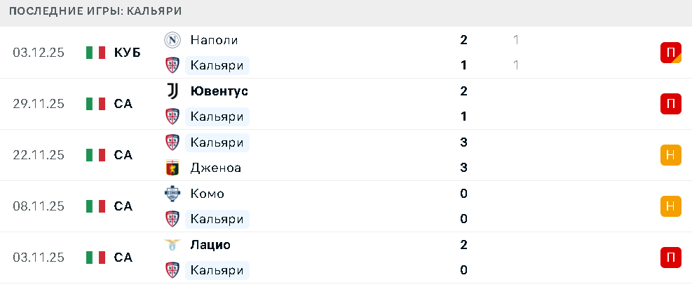 В предыдущих пяти матчах во всех турнирах островитяне не одержали ни одной победы: поражения от «Лацио» и «Ювентуса», а также ничьи с «Комо», «Дженоа» и «Наполи».