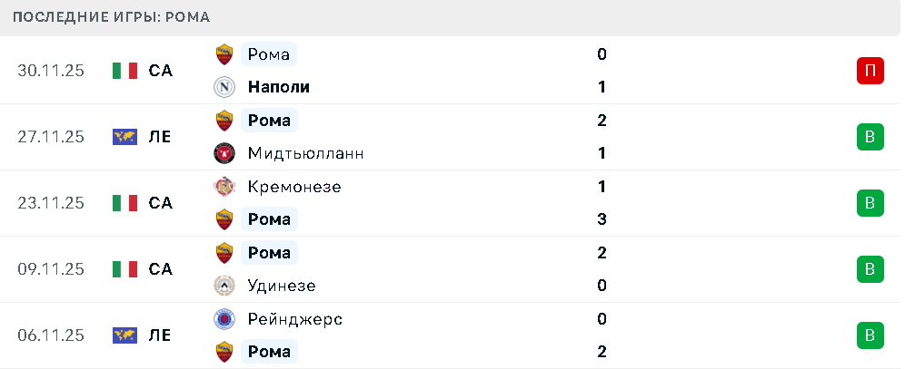 Поражение от «Наполи» стало единственным для римлян в пяти последних встречах. Также были победы над «Рейнджерс», «Удинезе», «Кремонезе» и «Мидтьюлланном».