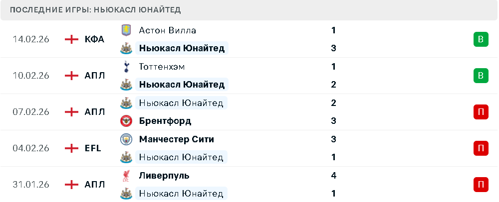 Последние игры Ньюкасла