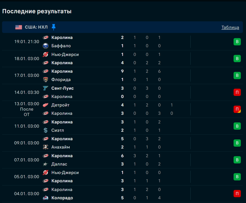 Последние игры Каролина Харрикейнз