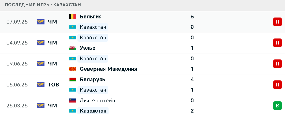 В пяти последних матчах сборная Казахстана одержала победу над Лихтенштейном и потерпела поражения от Беларуси, Северной Македонии, Уэльса и Бельгии.