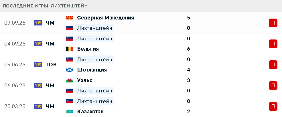 В пяти последних матчах сборная Лихтенштейна не забила ни одного гола, проиграв командам Казахстана, Уэльса, Шотландии, Бельгии и Северной Македонии.