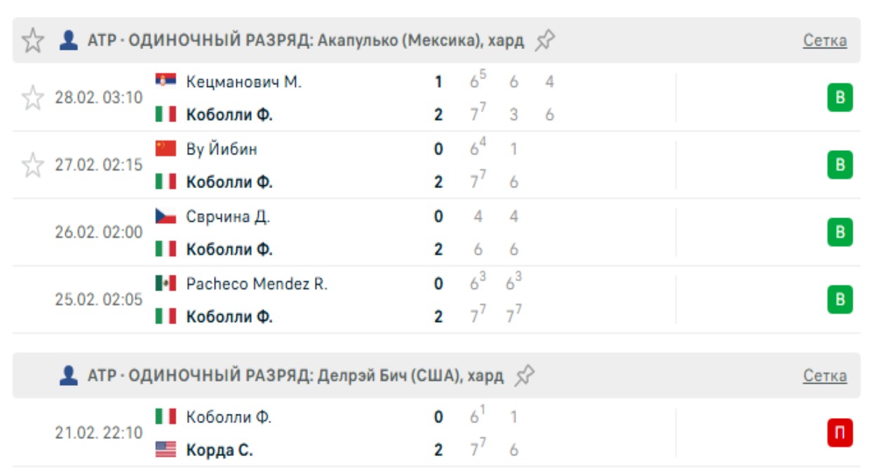 Коэффициент на победу Тиафо — 1.74, Коболли — 2.19. Букмекеры считают, что самый вероятный точный счет по партиям — 2:0 в пользу американца. Поставить на такой исход предлагается за 2.70.