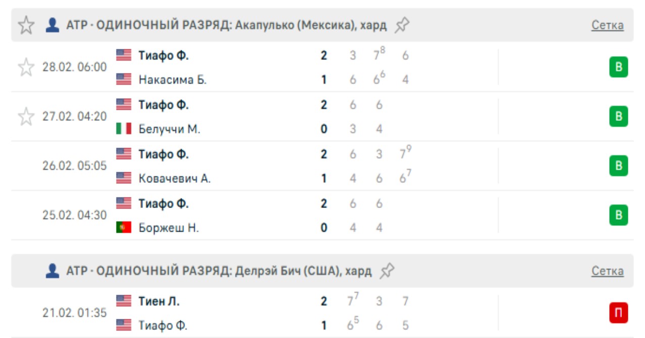Тиафо в Акапулько демонстрировал много атлетизма, гибкость в выборе решений и постоянные смены рисунка игры, что выбивало соперников из комфортного ритма. Американец активно использовал вариативность — от резких ускорений до выходов к сетке, а в защите нередко превращал сложные мячи в контратаку за счет скорости ног и реакции. При этом по ходу турнира было видно, насколько сильно его эффективность зависит от подачи. Когда первая летела и давала простые очки, Тиафо мог давить без пауз, а при просадках ему приходилось рисковать в розыгрышах.