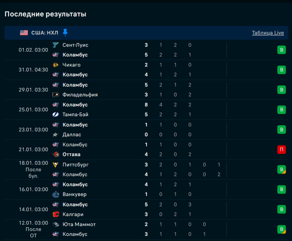 У «Коламбус Блю Джекетс» серия побед разной фактуры. С «Сент‑Луисом» 5:3 за счёт высокой эффективности, дома регулярно увозят первые периоды и без суеты закрывают концовки. На отрезке атака стабильно генерирует моменты, в большинстве стало больше тайминга, на синей уверенно подключается Веренски. Средняя результативность держится близко к 4 шайбам, а оборона реже проваливает смены.