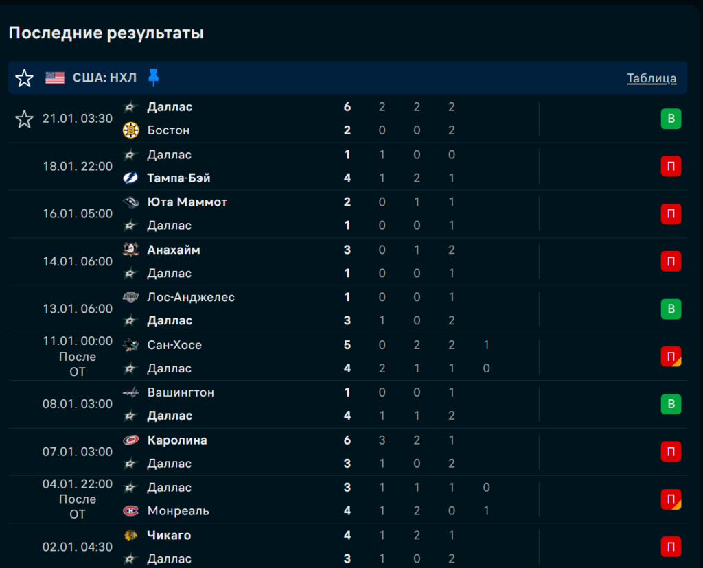«Старз» переживают спад: поражения от «Сиэтла» (1:2), «Тампы» (1:4), «Юты» (1:2) и «Анахайма» (1:3). Отсутствие Сегина критично: атака теряет остроту, несмотря на Робертсона и Хинтца. Оборона остаётся надёжной, но при текущей реализации это не спасает от поражений.