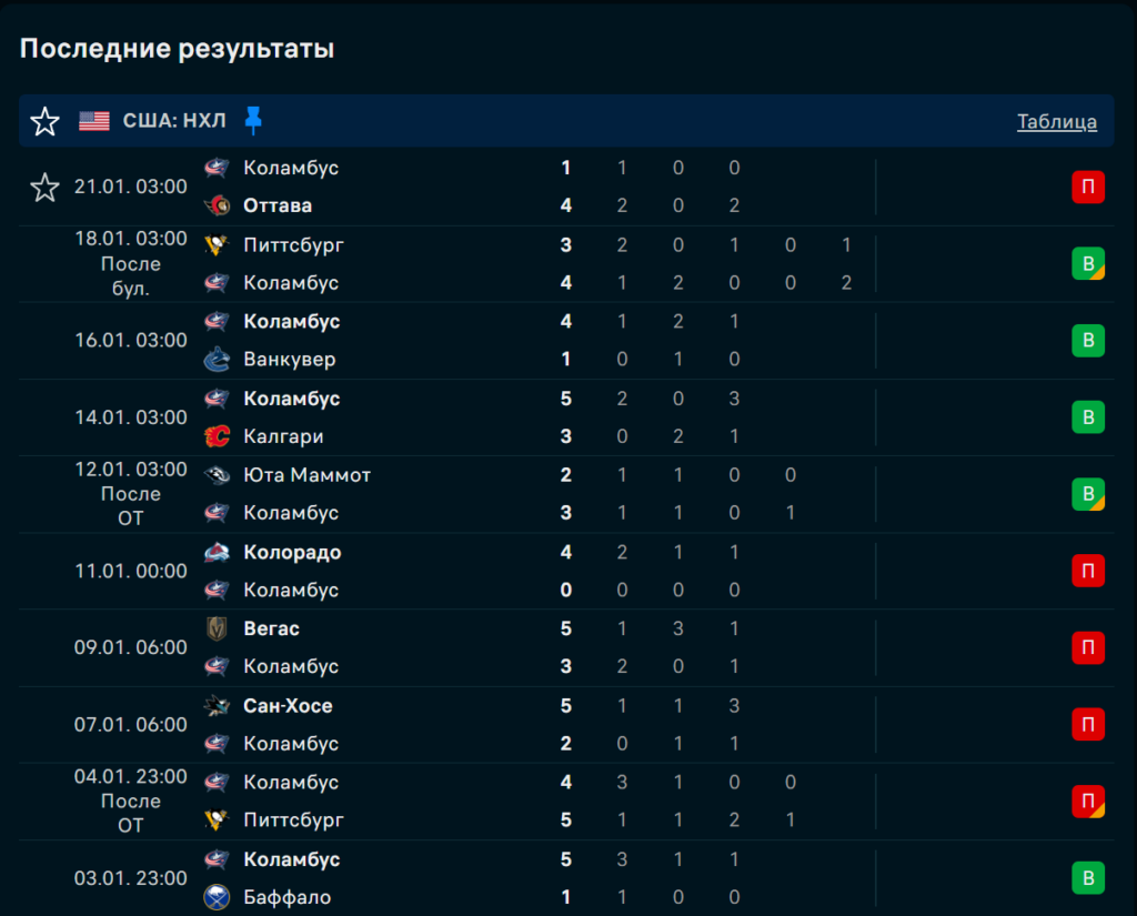 «Коламбус» демонстрируют лучшую форму сезона: победы над «Филадельфией» (2:1), «Питтсбургом» (4:3), «Ванкувером» (4:1) и «Калгари» (5:3). Атака работает эффективно благодаря Марченко, Воронкову и Веренски, но оборона остаётся уязвимой — пропускает 3,31 шайбы за игру. Тем не менее, на своём льду команда особенно опасна: в январе не проиграла ни разу.
