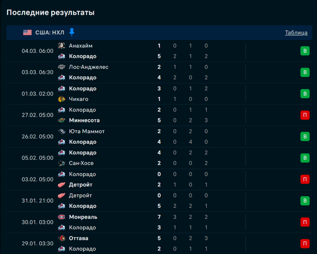 «Колорадо» в последних играх выглядит командой, которая умеет прибавить по ходу матча. У них высокий темп смен, много движения без шайбы и достаточно ресурса, чтобы не проседать в третьем периоде. Да, дома на отрезке бывали осечки, но по качеству игры это всё равно один из самых неприятных соперников лиги, особенно когда получается навязать длинные отрезки в чужой зоне.
