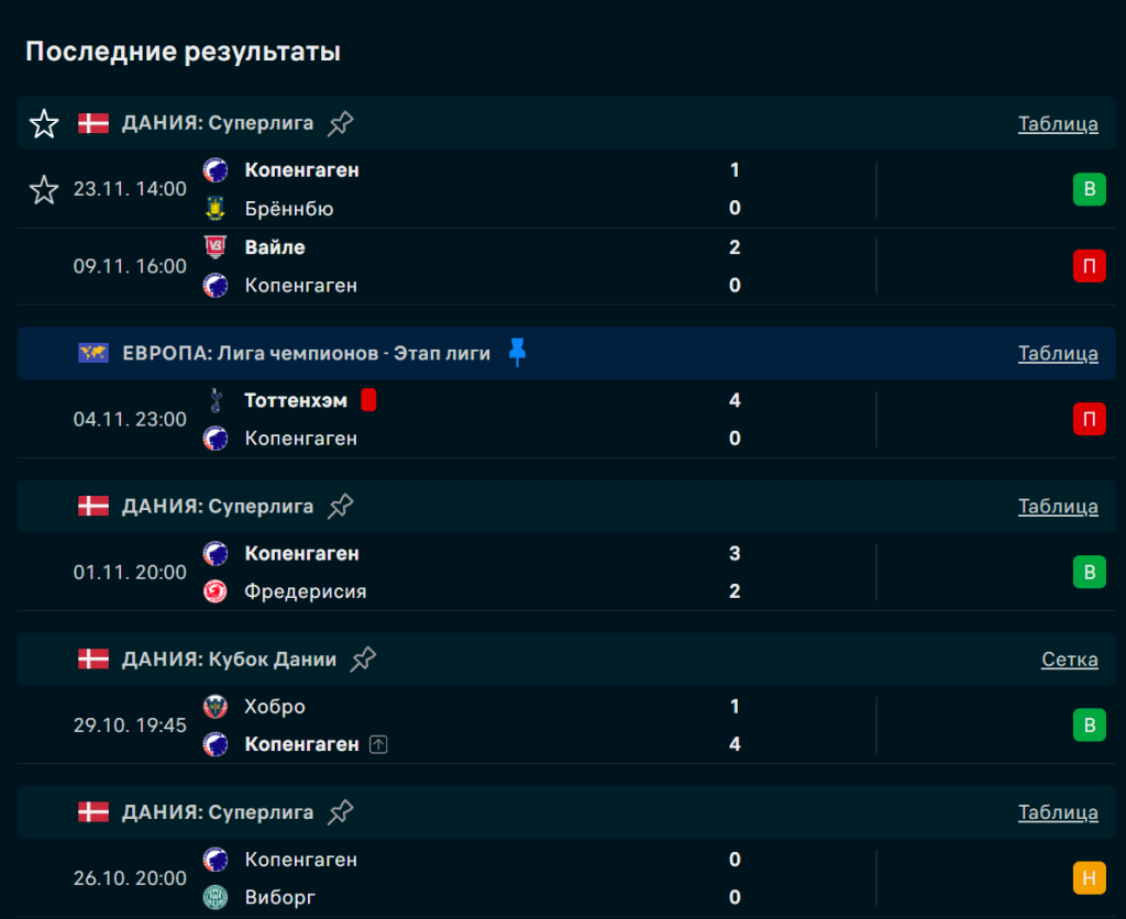 Последние результаты в Европе — три поражения подряд: от «Карабаха» (0:2), «Боруссии» (2:4) и «Тоттенхэма» (0:4). Дома в ЛЧ «Копенгаген» начал с ничьей против «Байера» (2:2). В последних матчах команда часто пропускает первыми — особенно в первые 30 минут, что стало системной проблемой.