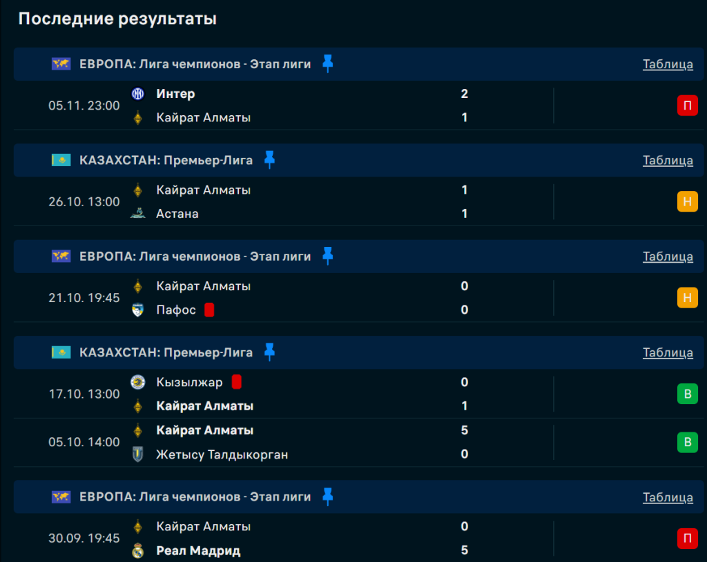 «Кайрат» стал чемпионом Казахстана, но в ЛЧ выступает как андердог. В 4 матчах — 1 очко (ничья с «Пафосом»), 2 гола забито (в том числе «Интеру»), 9 пропущено. Команда играет в низкий блок (часто 5-4-1), делает ставку на дисциплину, стандарты и контратаки. Несмотря на техничесое отставание, «жёлто-чёрные» умеют создавать моменты — даже против «Интера» и «Спортинга» забивали.