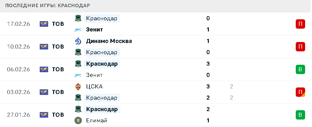 Последние игры Краснодара