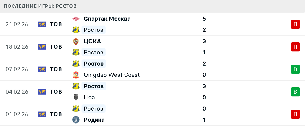 «Ростов» в пяти последних встречах потерпел поражения от «Родины», ЦСКА и «Спартака», но сумел обыграть «Ноа» и «Циньдао». Результаты говорят о нестабильности, особенно в матчах против соперников сопоставимого или более высокого уровня.