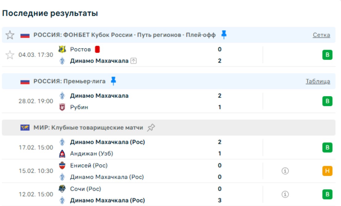 Последние игры Динамо Махачкала