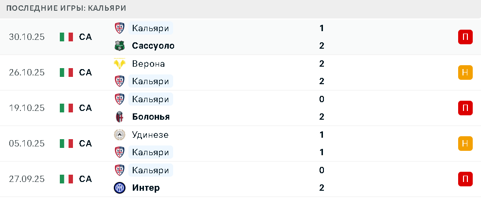 Последние игры Кальяри