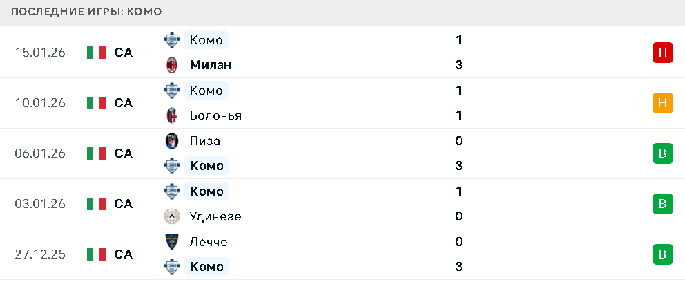 Поражение от «Милана» в прошлом туре стало единственным для «Комо» в пяти последних матчах. До этого были победы над «Лечче», «Удинезе» и «Пизой», а также ничья с «Болоньей».