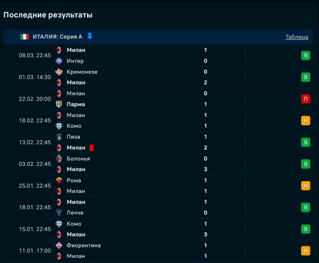 Последние игры Милан