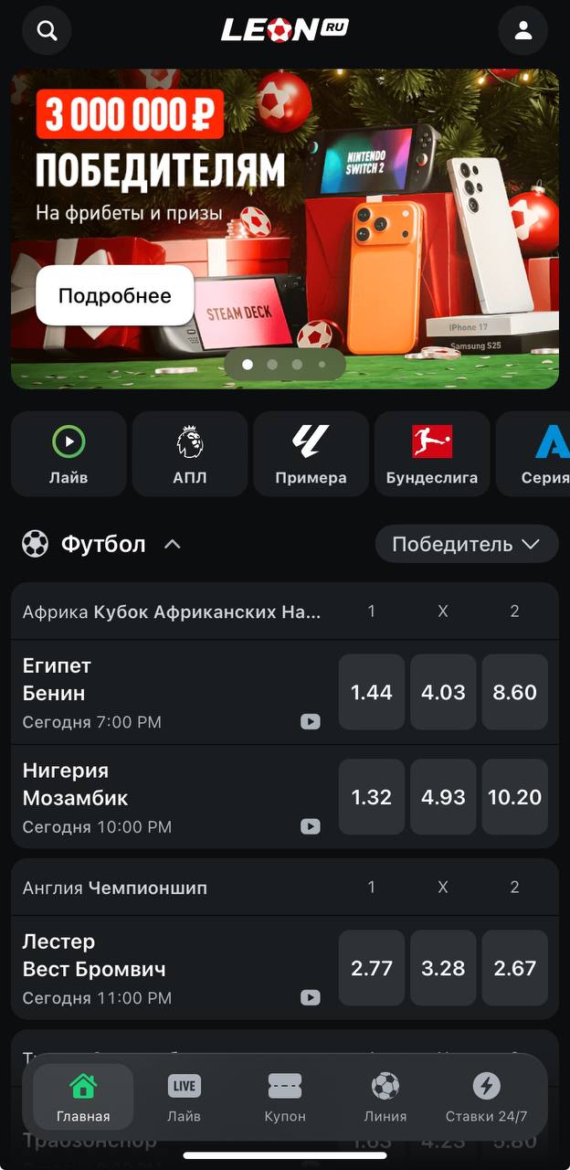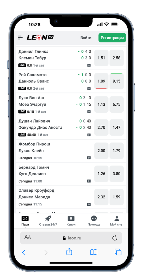 Мобильное приложение Леон предоставляет полный набор инструментов для ставок и управления аккаунтом, полностью заменяя браузерную версию сайта. Пользователь получает доступ ко всем основным возможностям букмекера в одном интерфейсе, что делает процесс игры более удобным и быстрым.
