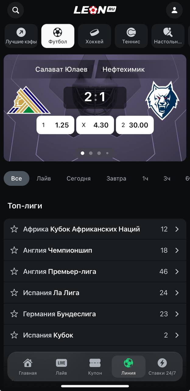 Мобильное приложение Леон разработано с упором на простоту и скорость работы. Все основные разделы размещены в главном меню и доступны буквально в пару касаний. Это позволяет быстро ориентироваться в линии, live-ставках и личном кабинете, что особенно удобно при игре в реальном времени, когда важна каждая секунда.