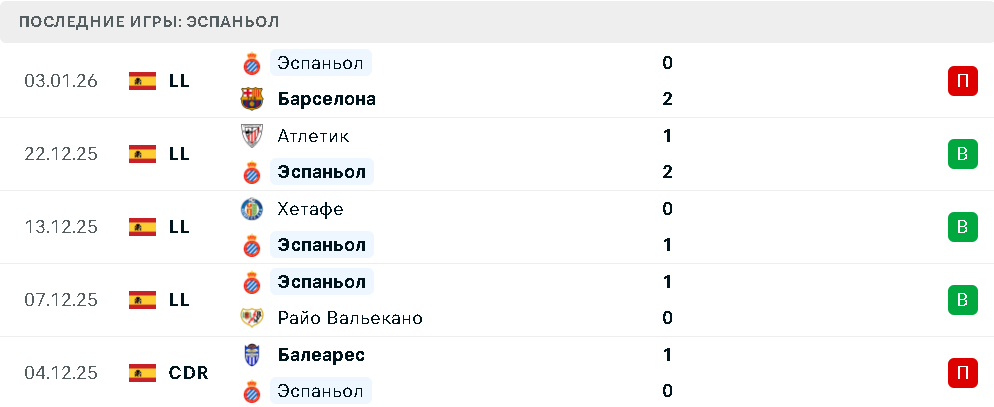 В пяти последних матчах в разных турнирах «Эспаньол» потерпел поражения от «Балеареса» и «Барселоны». Между этим были три победы над «Райо Вальекано», «Хетафе» и «Атлетиком».