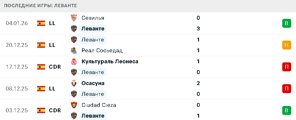 В пяти последних матчах в разных турнирах «Леванте» одержал победы над «Сьюдад Кьеза» и «Севильей». Между этим были поражения от «Осасуны» и «Культураль Леонесы», а также ничья с «Реал Сосьедадом».