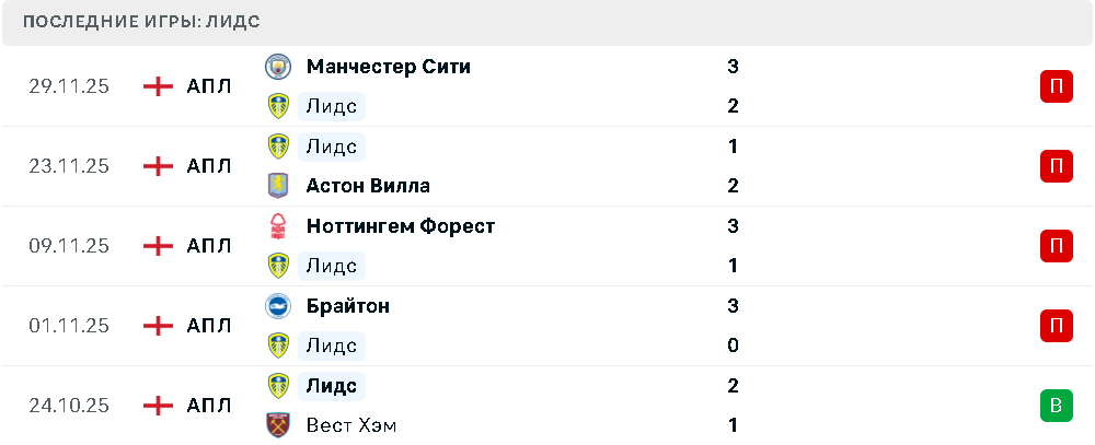 В пяти последних матчах «Лидс» после победы над «Вест Хэмом» потерпел четыре поражения подряд — от «Брайтона», «Ноттингем Форест», «Астон Виллы» и «Манчестер Сити».