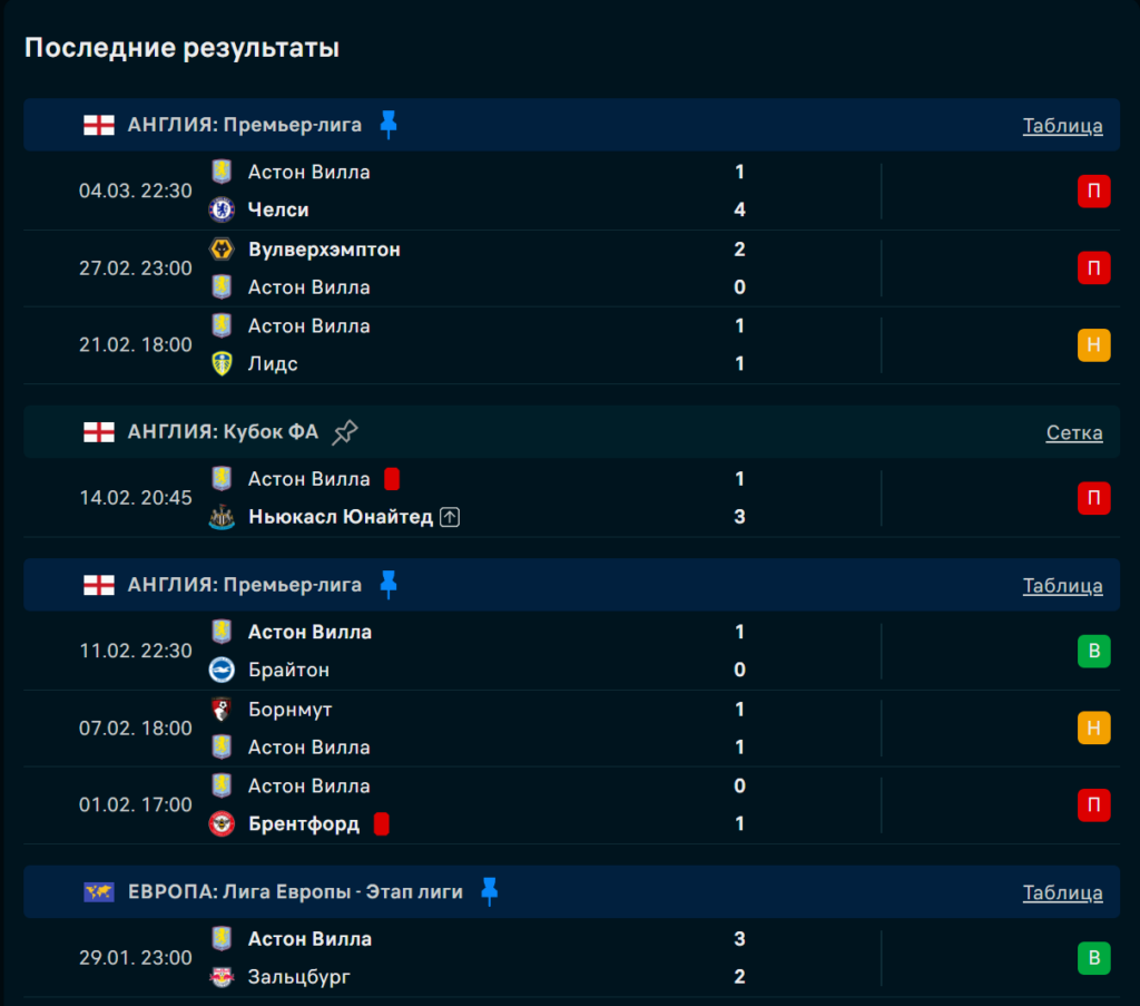 Последние игры Астон Вилла