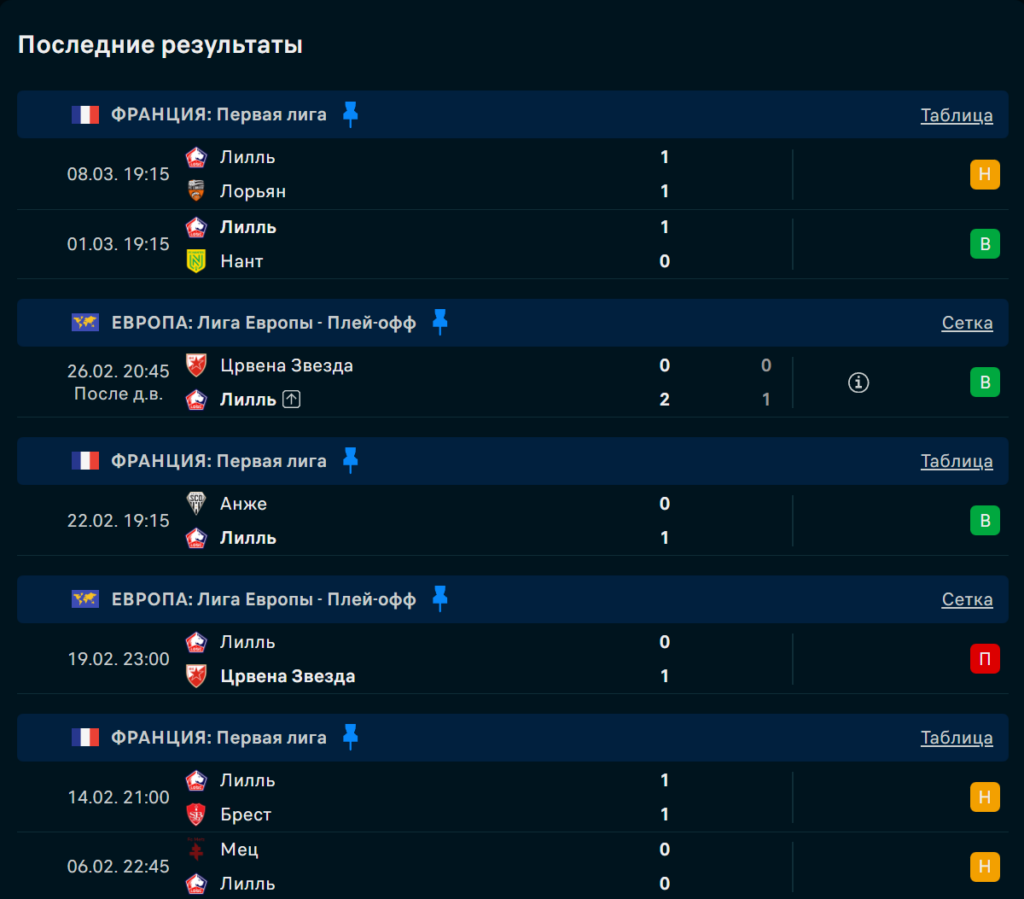 Последние игры Лилль