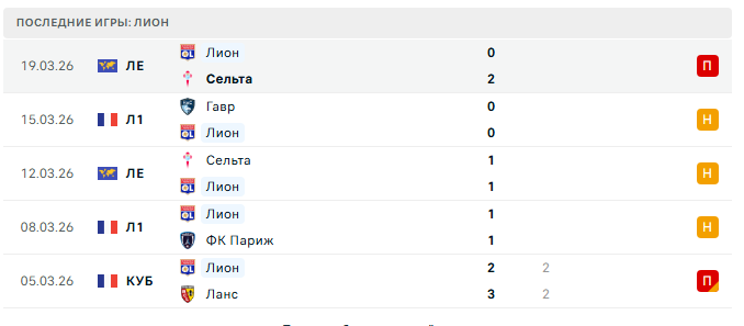 19 марта Лион уступил Сельте 0:2 дома — команда не создала ни одного опасного момента и пропустила оба мяча после потерь в центре.