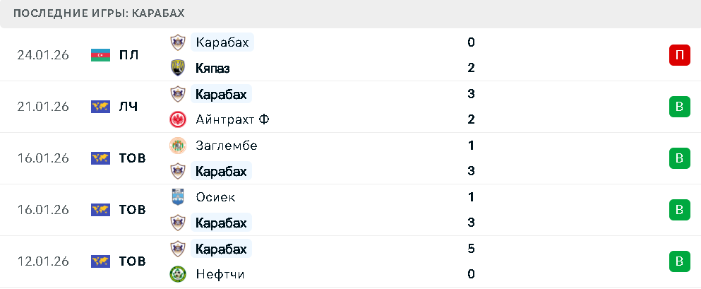 После важной победы над «Айнтрахтом» в Лиге чемпионов «Карабах» неожиданно уступил «Кяпазу» в национальном первенстве. До этого азербайджанский клуб одержал ряд побед в товарищеских матчах над «Нефтчи», «Осиеком» и «Заглембе», сохранив игровой тонус.